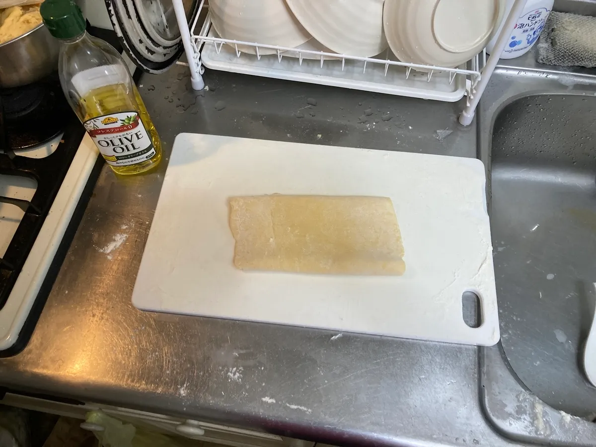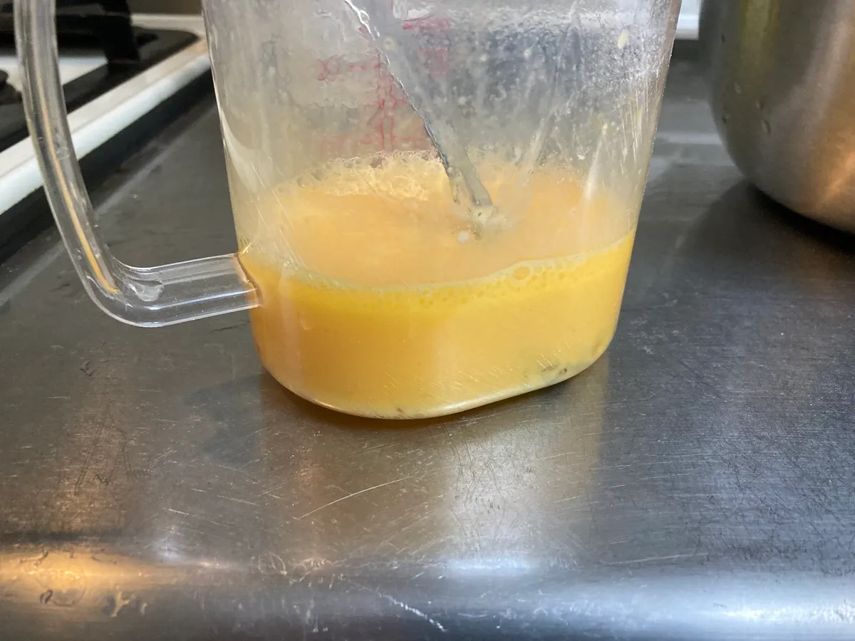 - 卵と水とオリーブオイルを計量カップに入れたら、水を足して合計150mlくらいになるようにする