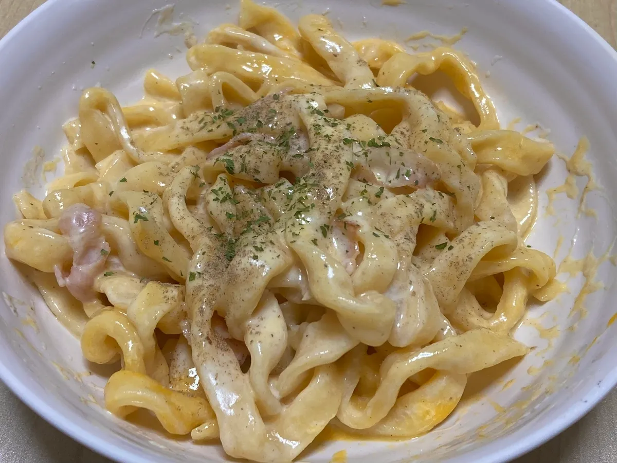 適当にカルボナーラを作って食べた(ブラックペッパーがなかった・盛り付け失敗したのでちょっと見た目が残念)。
